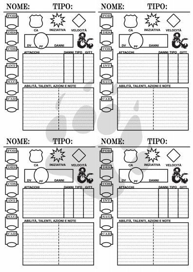 It shames many other thirdparty products I would have paid for this level of editing, really Our group will definitely use it Thanks!. D&D 35 Scheda degli incantesimi (4551 download) D&D 35 Scheda pieghevole (by Dragons' Lair) (4552 download) D&D 35 Scheda alleato o mostro evocato (3102 download) D&D 35 Scheda Excel (4397 download) D&D 35 Scheda del ranger (1722 download) D&D 4° edizione Scheda del giocatore (4375 download) D&D 4° edizione Scheda. Start date Nov 16, 15;.